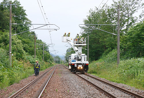 弘栄電気は、JR北海道の電車架線工事を通し、社会インフラの根幹である交通の発展や安全性の向上、メンテナンス業務を行い、鉄道の大動脈ともいえる電力の安定供給の一翼を担う会社です。