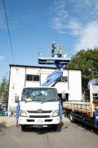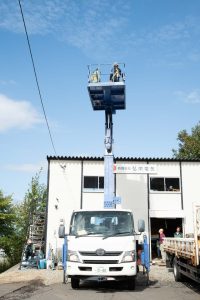 それから安全を対策のフルハーネス、ヘルメットを着用し高所作業車に乗り地上から9.9mの世界へ~
